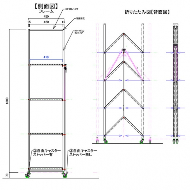 キャスター(ストッパー付)の取付が可能です。